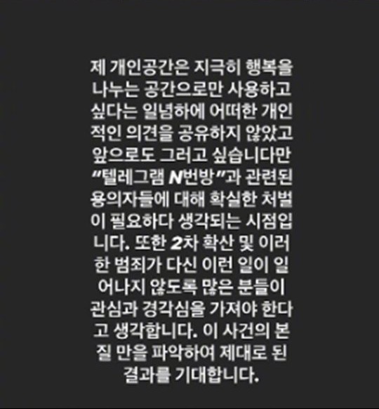 “个人认为,个人空间只是分享幸福的空间,因此没有共享过任何个人意见,今后也想那样做,但我认为有必要对“Telagram N号房”相关嫌疑人进行切实的处罚。