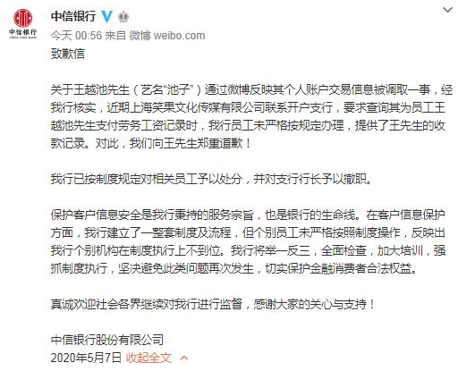 5月7日凌晨1时许,中信银行通过官方微博发布了《致歉信》,“关于王越池先生(艺名“池子”)通过微博反映其个人账户交易信息被调取一事,经我行核实,近期上海笑果文化传媒有限公司联系开户支行,要求查询其为员工王越池先生支付劳务工资记录时,我行员工未严格按规定办理,提供了王先生的收款记录。对此,我们向王先生郑重道歉!”