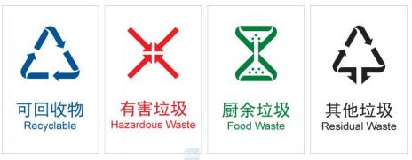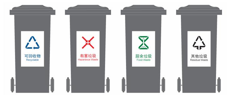 试点区域执行四分法分类标准:即有害垃圾、可回收物、厨余垃圾、其他垃圾。