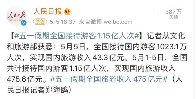 据文化和旅游部综合测算,2020年“五一”假日期间(5月1日至5月5日),全国共计接待国内游客1.15亿人次,实现国内旅游收入475.6亿元。