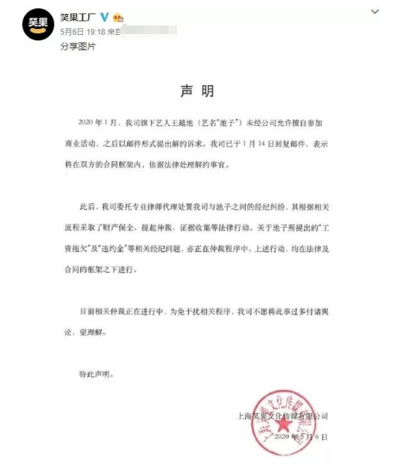 池子还在文中表示:“去年(2019年)我发现笑果文化违约,拖欠了很多应付的演艺报酬,而且没有按照合同给我账单明细,我提出异议之后,笑果基本上刻意停止了我的一切工作,我多次提出和平解约,笑果不同意,我只能提出仲裁,让他们付清我的报酬。然后笑果文化也提出仲裁,让我赔给他们3000多万。”