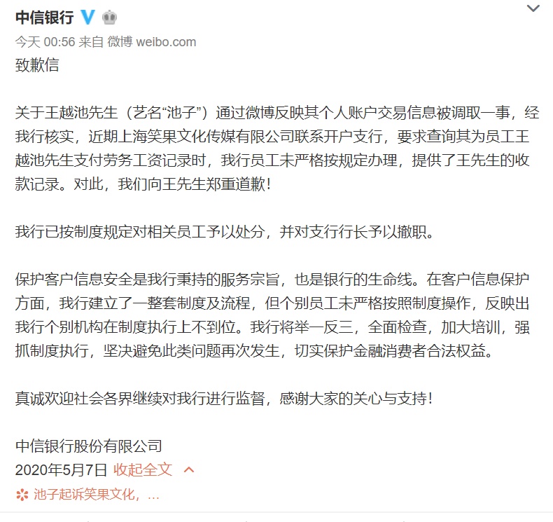 声明发布后的5月7日凌晨,中信银行在其官方微博中发表致歉信,表示王越池反映的情况属实。在笑果文化联系开户行要求查询其员工王越池支付劳务工资记录时,该行员工未严格按照规定办理,提供了王越池的收款记录。目前已按制度规定对相关员工予以处分,并对支行行长予以撤职。