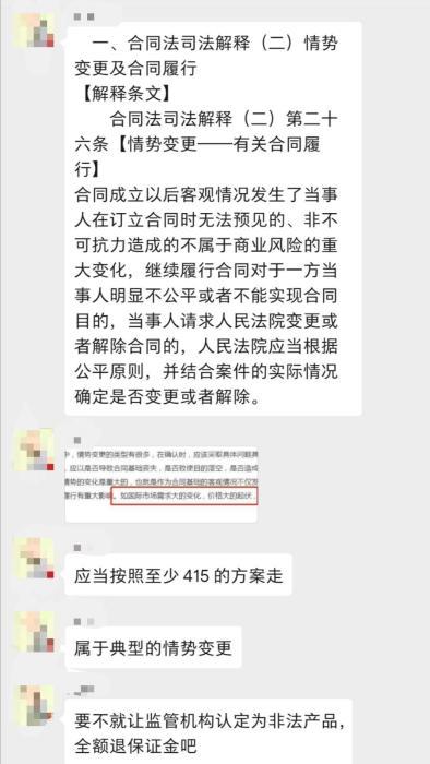 “扛不住压力的就签吧,已经签了合同的就自动退群,接到电话的人要珍惜机会,努力协商。”“有时间有精力就继续坚持,利益得靠自己争取。”投资人们在群里不断更新相关信息,互相加油鼓劲。