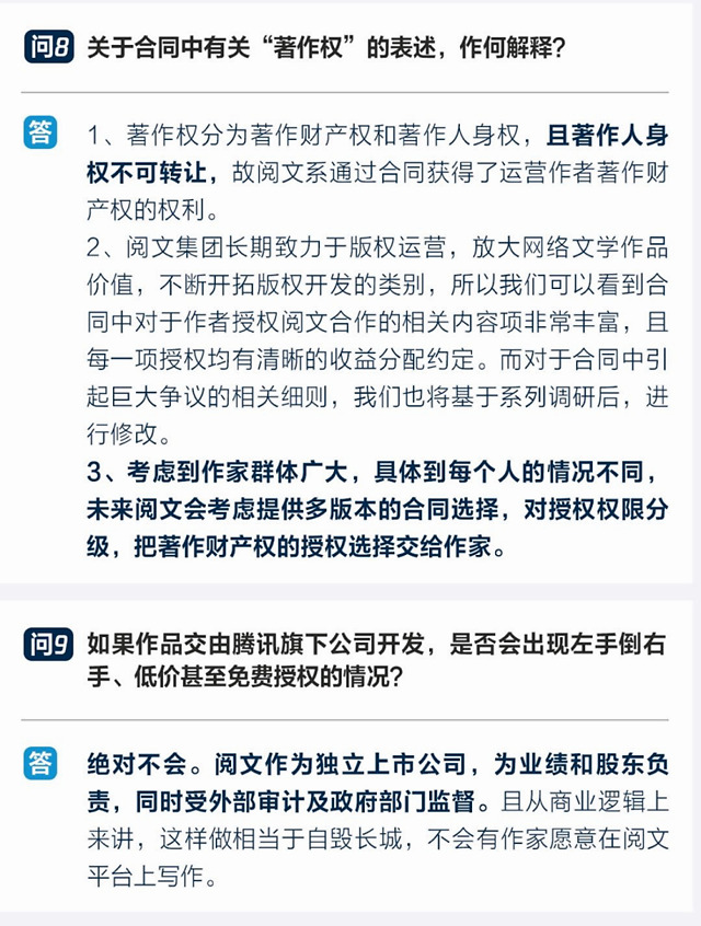 对阅文来说,尤其长期致力于版权运营,放大网络文学作品价值,不断开拓版权开发的类别,所以在合同中,可以看到对于作者授权阅文合作的相关内容项非常丰富,且每一项授权均有清晰的收益分配约定。至于合同中引起巨大争议的相关细则,阅文也明确表示,会在对作者进行系列调研后,进行修改。