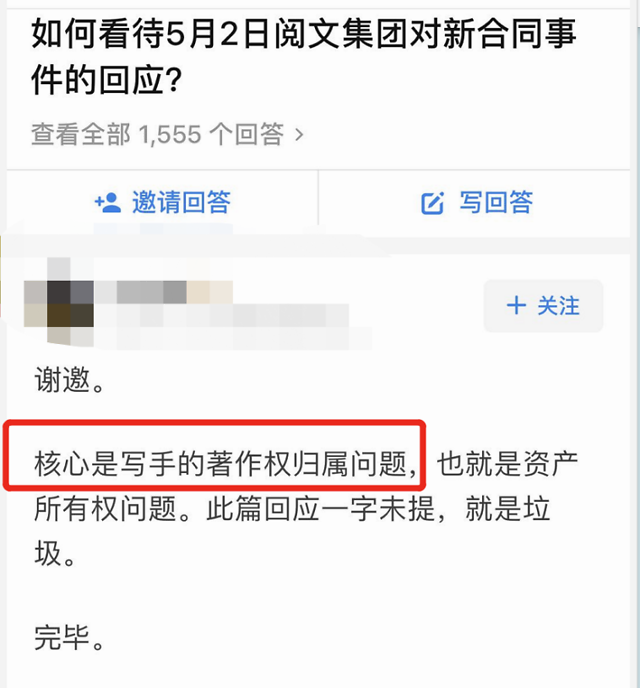著作权是这次争议的核心,之前传得绘声绘色,阅文就是想把作家都当成自己的包身工。知乎上每次出现一个阅文相关的问题,下面第一条留言,问的都是著作权归属问题。