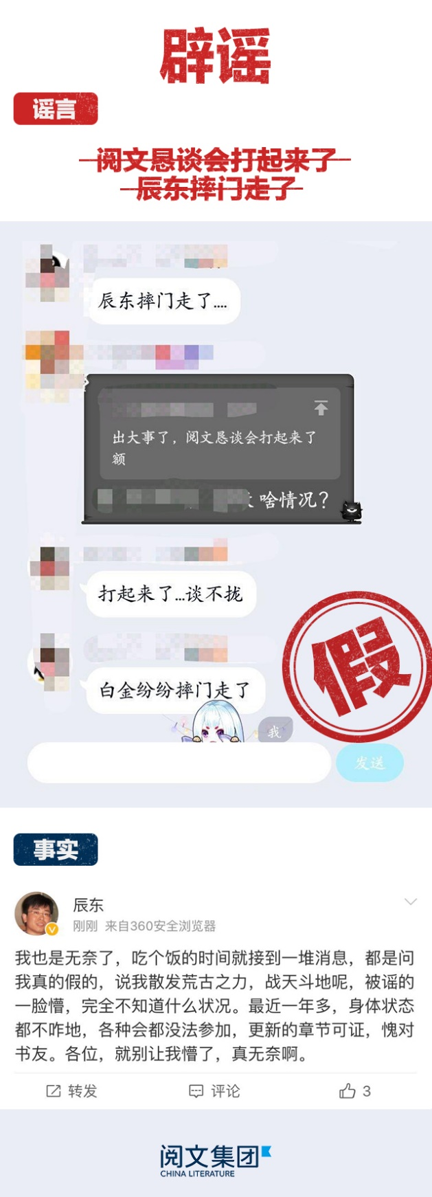 之前传出阅文新管理团队,要组织和网络文学作家的恳谈会。就有谣言说,这些参会的作家都是内定的。甚至绘声绘色的说,之前被网暴的大神唐家三少也会参加,都是资本的套路。