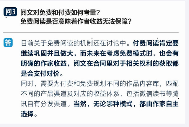 新管理团队来了,是不是意味着阅文以后就要走免费阅读的路子了。虽然对这个谣言,阅文已经三番五次的辟谣,但是在微博和知乎上还是被人言之凿凿的讨论。这其实也能理解,毕竟这个关系到绝大多数作者的收入,很多人靠这个来养家糊口。在恳谈会上,阅文新管理团队把这个问题也说得明明白白了。