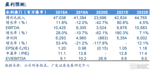 20-22 年 EBITDA 分别为 35.24 亿、98.78 亿和 105.83 亿港元。考虑到疫情对澳门博彩业的影响是短期的,因此我们基于公司 21 年EBITDA 98.78 亿港元计算公司估值。由于目前距离 21 年还有一段时间,我们给予公司 21 年历史中枢向下 1 倍标准差 EV/EBITDA 11.6x,计算得到公司合理价值为 17.2 港元/股,维持持有评级。