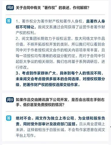 对于最受关注的著作权条款,阅文集团新任CEO程武明确表示,著作权包括著作人身权和著作财产权两部分。著作人身权,是作者不可转让、不可剥夺的权利,属于作家独有。阅文绝不会通过任何方式分享或获取这种权利。同时对于包括改编版权等各种衍生权利在内的著作财产权,将会在双方自愿的前提下,为作者的授权匹配对应的权益。对等是根本原则。我们也感谢很多作者对我们的信任,愿意把作品授权给我们进行推广和增值。他进一步提到,同时,也考虑到作家群体广大,具体到每个人的情况不同,未来我们会考虑提供多版本的合同选择,对授权权限分级,把选择权交给作家。