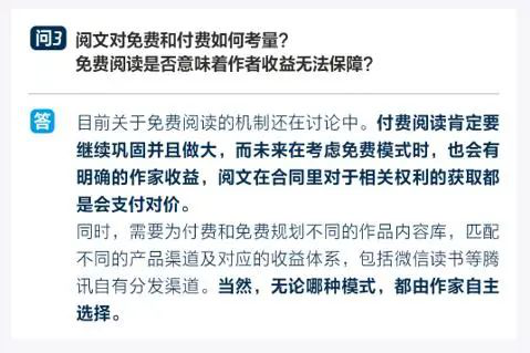 关于付费和免费模式,阅文集团总裁侯晓楠坦言,目前关于免费阅读的机制还在讨论中。付费阅读肯定要继续巩固并且做大,而未来在考虑免费模式时,也会有明确的作家收益。同时,需要为付费和免费规划不同的作品内容库,匹配不同的产品渠道及对应的收益体系。当然,无论哪种模式,都由作家自主选择。