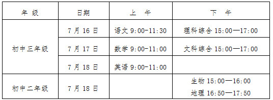 初二年级书面考试科目为生物(100分)和地理(100分)。