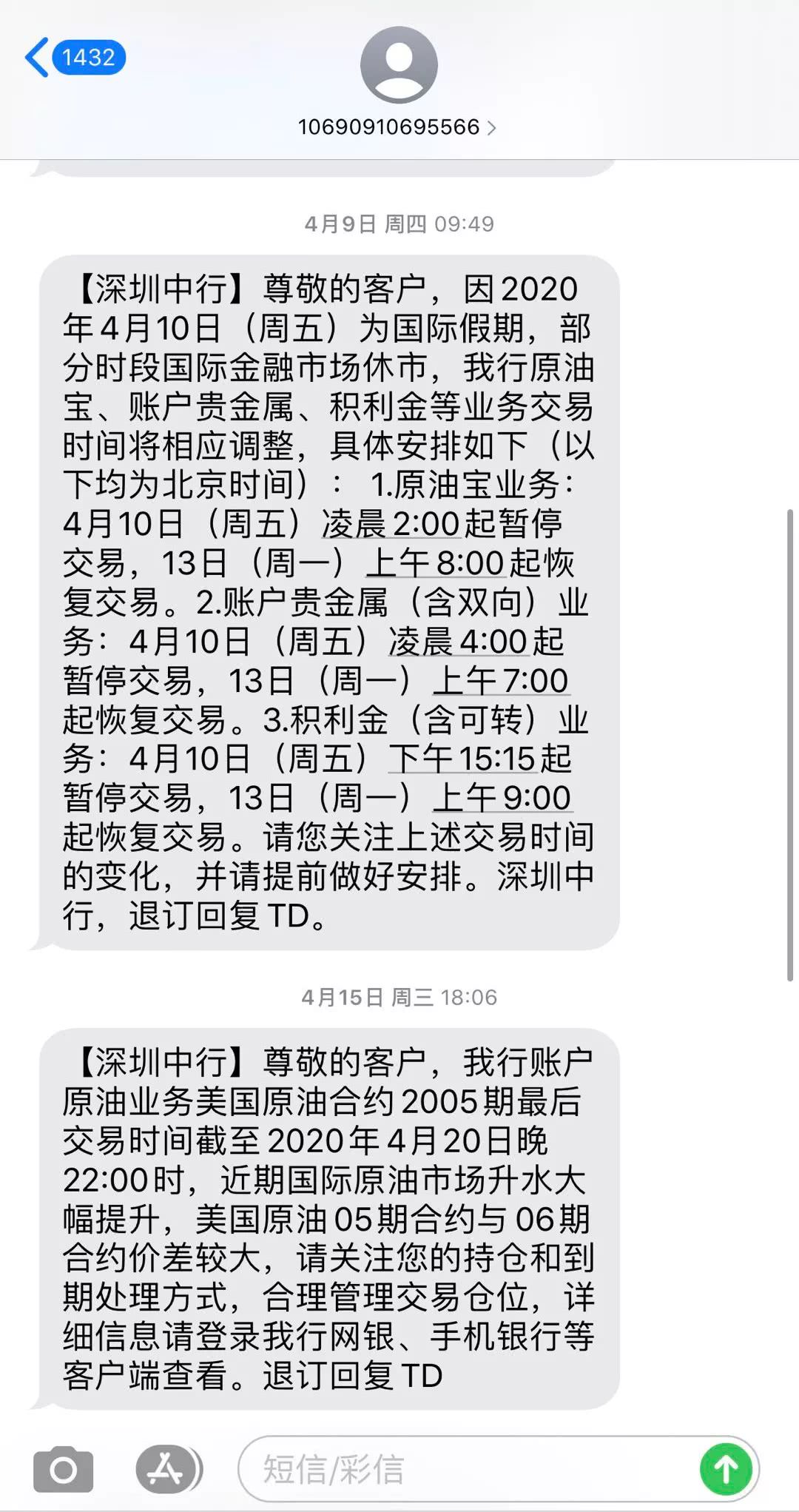 从投资人提供的信息显示,中国银行的确进行了风险提示,中行官方声明也表示,自4月6日起,中行通过短信、电话、公众号、官方微博等多种渠道,向“原油宝”客户多次进行针对性风险提示,特别是4月15日以后,每日向客户进行风险提示。