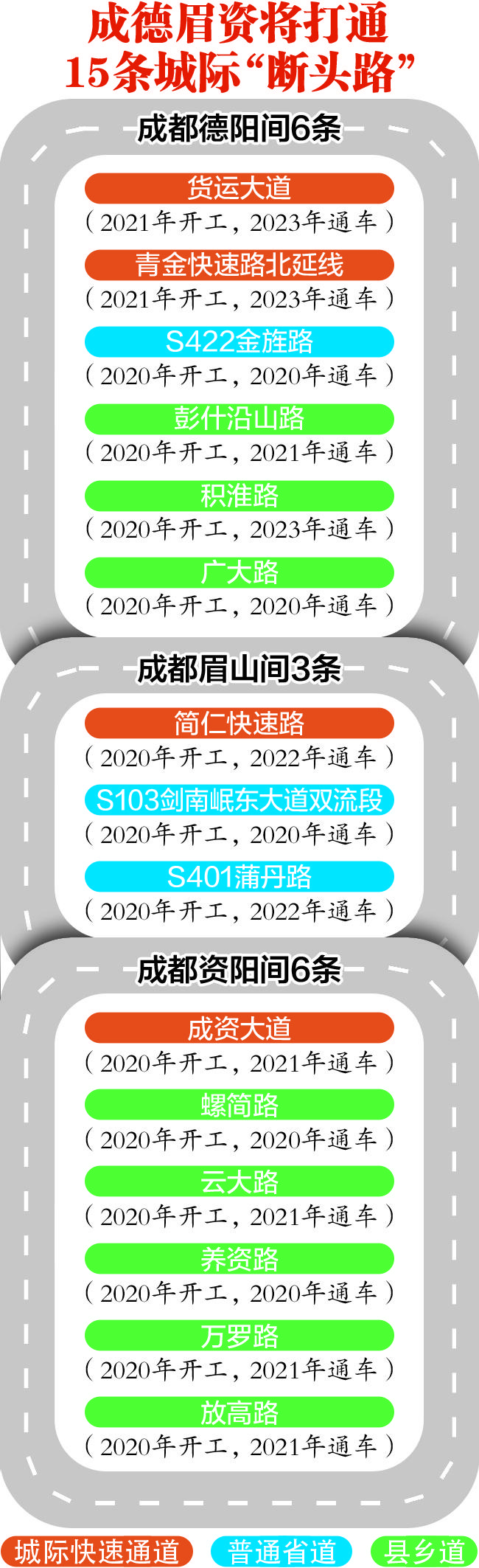根据计划,成德眉资打通同城化城际“断头路”项目共计15个,总投资约172亿元。其中,成德间“断头路”项目6个,包括城际快速通道2条、普通省道1条、县乡道3条,项目总投资54亿元;成眉间“断头路”项目3个,包括城际快速通道1条、普通省道2条,项目总投资70.9亿元;成资间“断头路”项目6个,包括城际快速通道1条、县乡道5条,项目总投资46.9亿元。2020年将开工建设13条,其中S103剑南岷东大道双流段改造、S422金旌路、广大路、养资路、螺简路5条道路将建成通车,其余项目将于2023年底前陆续建成。