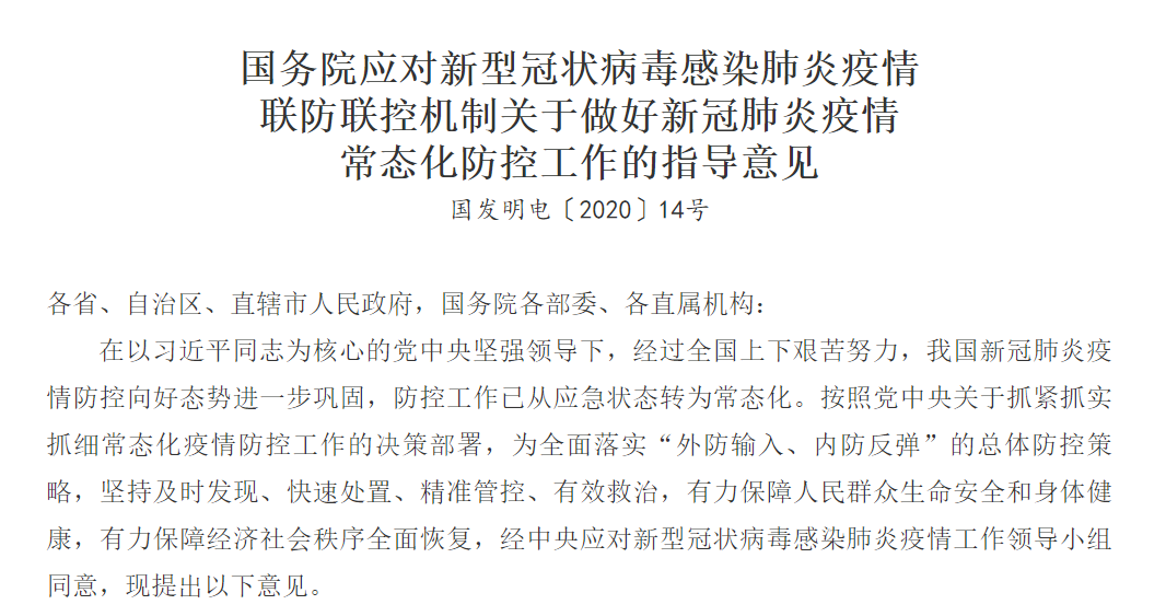 国务院印发应对新型冠状病毒感染肺炎疫情联防联控机制关于做好新冠肺炎疫情常态化防控工作的指导意见。指导意见提出,按照相关技术指南,在落实防控措施前提下,全面开放商场、超市、宾馆、餐馆等生活场所;采取预约、限流等方式,开放公园、旅游景点、运动场所,图书馆、博物馆、美术馆等室内场馆,以及影剧院、游艺厅等密闭式娱乐休闲场所,可举办各类必要的会议、会展活动等。