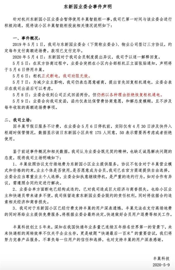 5月9日下午,针对杭州东新园小区因不满丰巢快递柜收费而暂停使用一事,丰巢科技发布《东新园业委会事件声明》称: