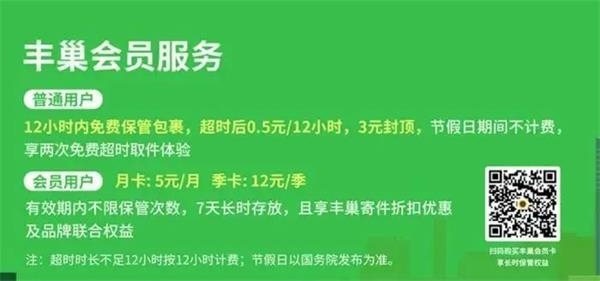 普通用户12小时内免费保管包裹,超时后0.5元/12小时,3元封顶,节假日期间不计费;会员用户月卡每月5元,季卡每季12元,有效期内不限保管次数,7天长时存放,且享丰巢寄件折扣优惠及品牌联合权益。
