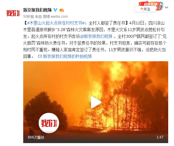 4月12日,四川凉山木里县通报项脚乡“3.28”森林火灾案案发原因,木里火灾系11岁男孩点燃松针引发。起火点所在村的村支书告诉@新京报我们视频 ,全村300户居民都签订了“见火就罚”森林防火责任书。对于签责任书的效果,村支书坦言,确实可能存在极个别村民不重视。嫌疑人家庭肯定签订了责任书,11岁男孩意识不强,没把防火当回事。