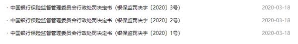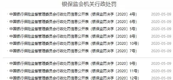 上述9张罚单,均属于“银保监会机关行政处罚”。此前,编号为“银保监罚决字[2020]”1、2、3号的处罚决定书已于今年3月18日公布。