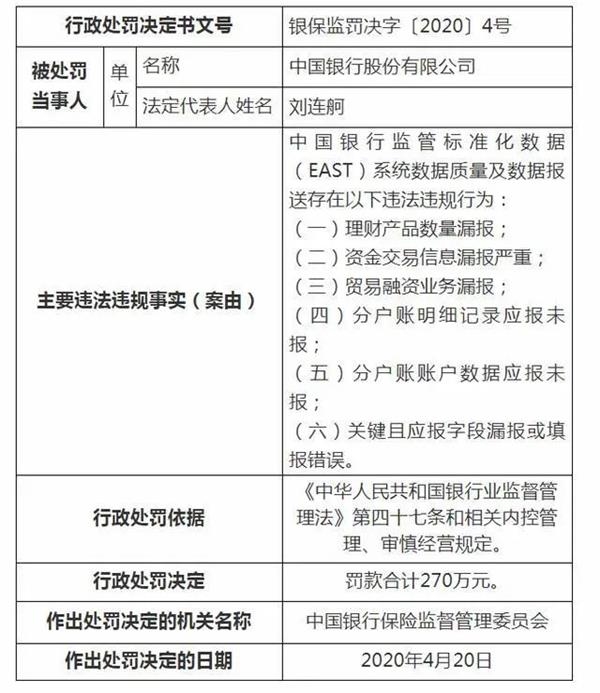 中国银行保险监督管理委员会行政处罚信息公开表显示,中国银行股份有限公司因存在理财产品数量漏报;资金交易信息漏报严重;贸易融资业务漏报;分户账明细记录应报未报;分户账账户数据应报未报;关键且应报字段漏报或填报错误的行为,被罚款合计270万元。