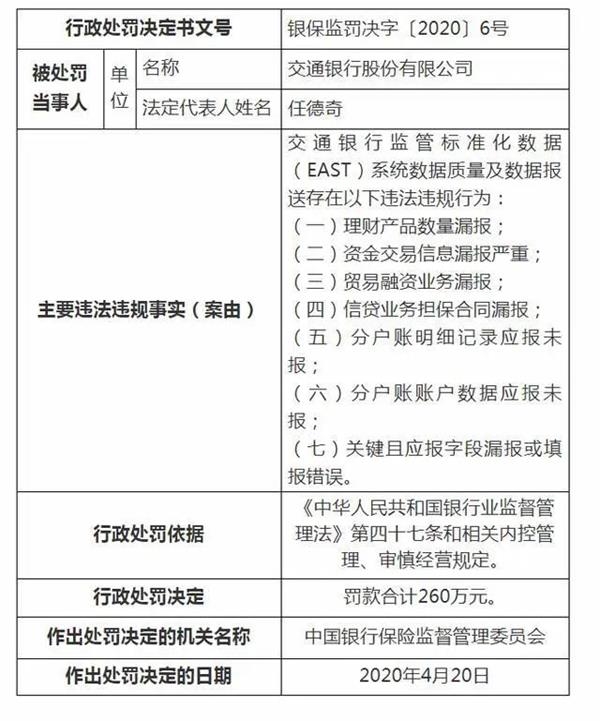 交通银行监管标准化数据(EAST)系统数据质量及数据报送存在以下违法违规行为:理财产品数量漏报;资金交易信息漏报严重;贸易融资业务漏报;信贷业务担保合同漏报;分户账明细记录应报未报;分户账账户数据应报未报;关键且应报字段漏报或填报错误。罚款合计260万元。
