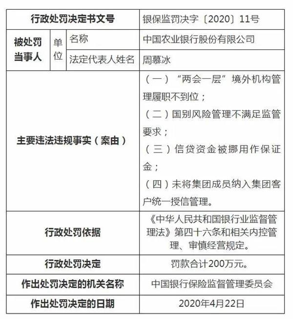 中国农业银行股份有限公司收到两份行政处罚决定,在银保监罚决字〔2020〕11号文件中显示其主要违法违规事实(案由)有:“两会一层”境外机构管理履职不到位;国别风险管理不满足监管要求;信贷资金被挪用作保证金;未将集团成员纳入集团客户统一授信管理。罚款合计200万元。