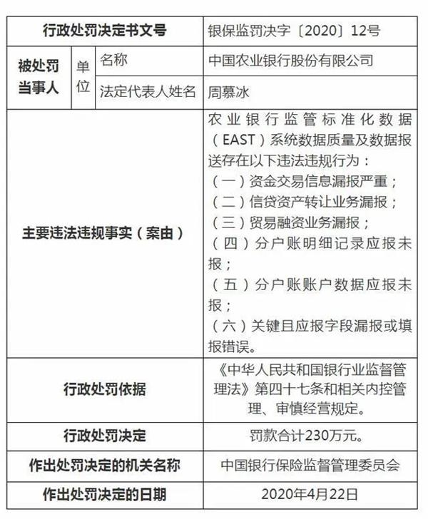 在银保监罚决字〔2020〕12号文件中,农业银行监管标准化数据(EAST)系统数据质量及数据报送存在以下违法违规行为:资金交易信息漏报严重;信贷资产转让业务漏报;贸易融资业务漏报;分户账明细记录应报未报;分户账账户数据应报未报;关键且应报字段漏报或填报错误。罚款合计230万元。