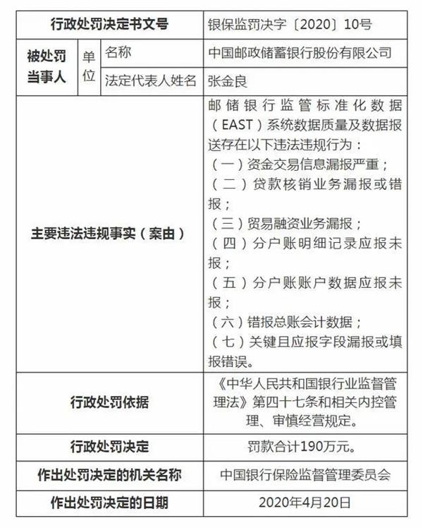 邮储银行监管标准化数据(EAST)系统数据质量及数据报送存在以下违法违规行为:资金交易信息漏报严重;贷款核销业务漏报或错报;贸易融资业务漏报;分户账明细记录应报未报;分户账账户数据应报未报;错报总账会计数据;关键且应报字段漏报或填报错误。罚款合计190万元。