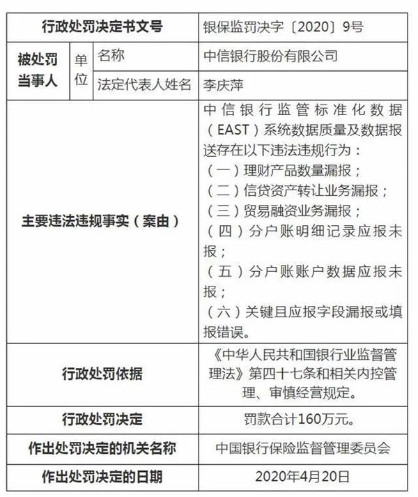 中信银行监管标准化数据(EAST)系统数据质量及数据报送存在以下违法违规行为:理财产品数量漏报;信贷资产转让业务漏报;贸易融资业务漏报;分户账明细记录应报未报;分户账账户数据应报未报;关键且应报字段漏报或填报错误。罚款合计160万元。