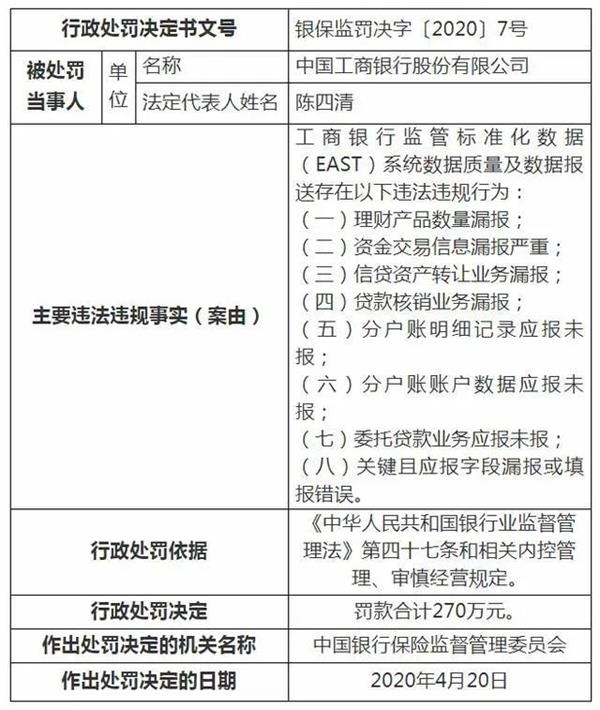 工商银行监管标准化数据(EAST)系统数据质量及数据报送存在以下违法违规行为:理财产品数量漏报;资金交易信息漏报严重;信贷资产转让业务漏报;贷款核销业务漏报;分户账明细记录应报未报;分户账账户数据应报未报;委托贷款业务应报未报;关键且应报字段漏报或填报错误。罚款合计270万元。