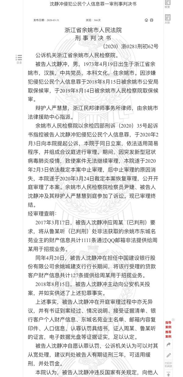 更早的3月底,建行余姚城建支行原行长沈某某,将1111条非法获取的余姚市东城名苑业主的财产信息,和127条该行受理的贷款客户财产信息提供给别人,用于招揽业务,犯侵犯公民个人信息罪,被判处有期徒刑3年,缓刑3年,并处罚金6000元。