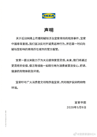 宜家官方微博5月9日发布的信息称:关于近日网络上传播的疑似涉及宜家商场的视频事件,宜家中国非常重视。宜家坚决反对并谴责这种行为,并已第一时间向疑似受影响的商场所在城市的警方报警。宜家致力于为大众提供家居灵感,营造安心、舒适、健康的购物体验及环境,呼吁广大消费者文明有序逛宜家,共同维护良好的购物环境。