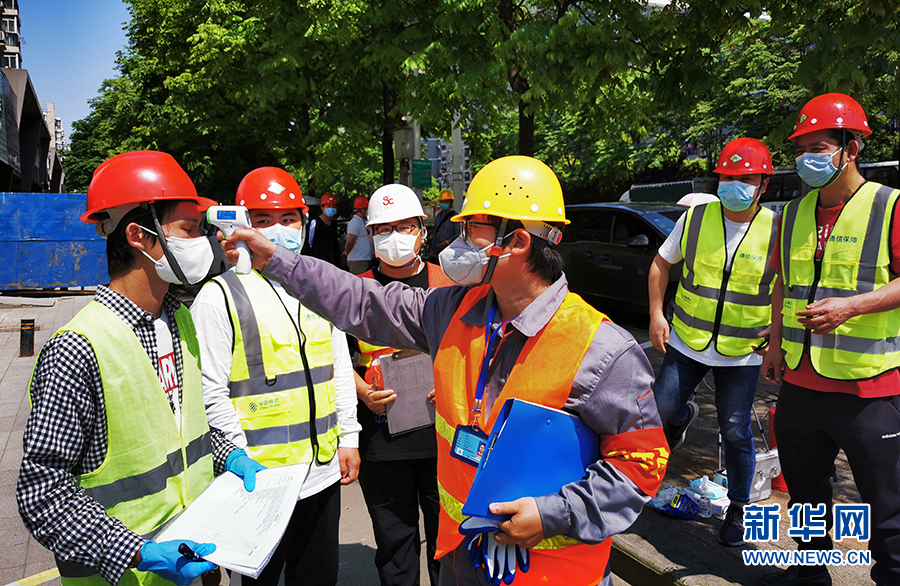8日,在武汉市春雷建材市场附近的一处5G基站施工现场,工人们经过扫码、测温和全身消毒后进入现场开始施工。五一小长假期间,我们都一直在施工。湖北移动公司武汉江岸区建维中心5G项目经理付毅说。为了减少人员聚集、抓好疫情防控和安全规范,施工现场还部署了云监控视频系统。从施工人员开始准备,一直到整个站点完工,全程进行云上传。后台随时监控施工中有没有违规操作,有没有风险防范意识不达标等行为。
