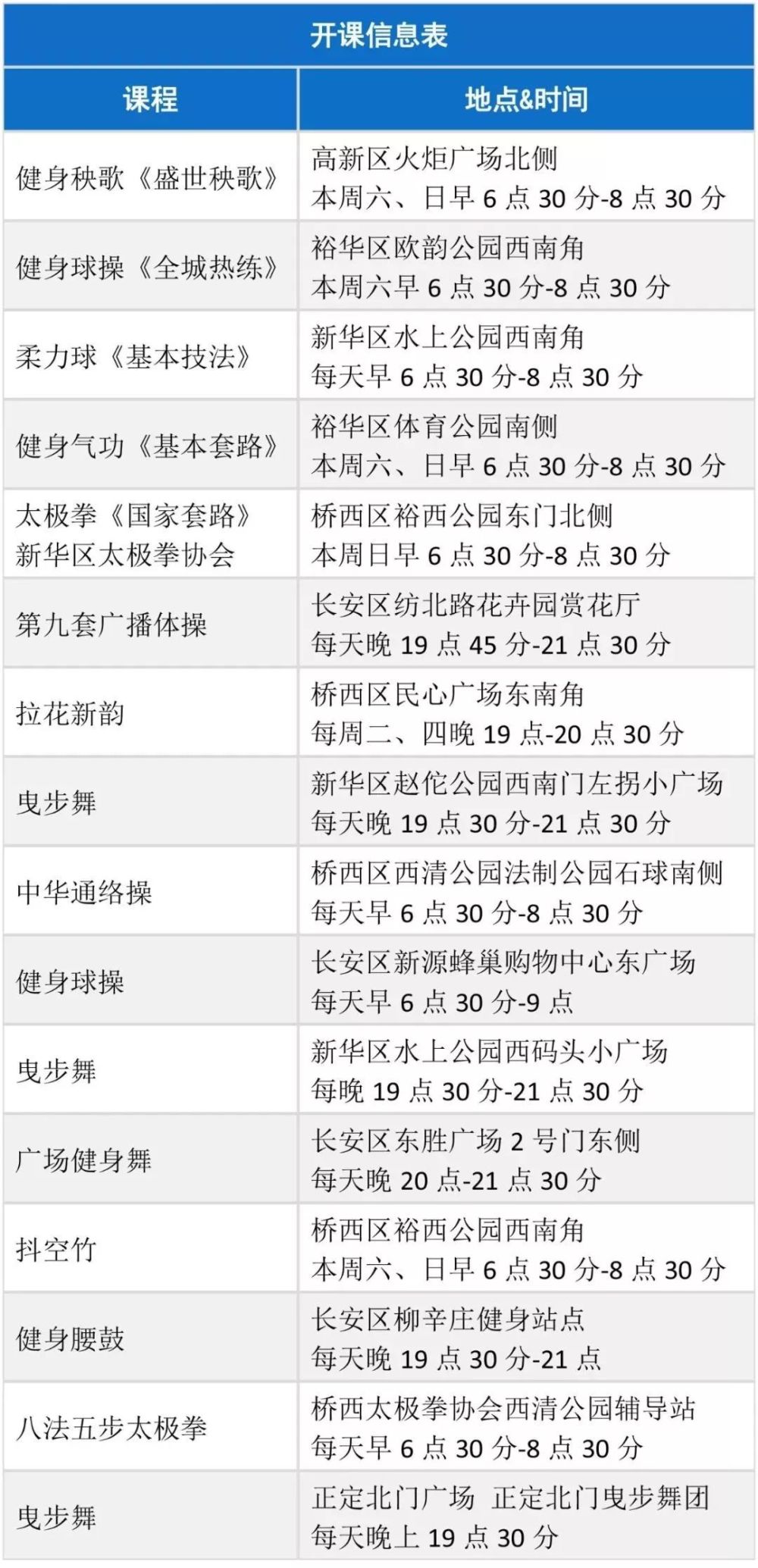 社会体育公开课面向全市人民,课程免费,开课地点为石家庄范围内的各大公园和广场(正定北门广场)。课程表就在下面啦,通妹号召大家:全民健身,一起来!