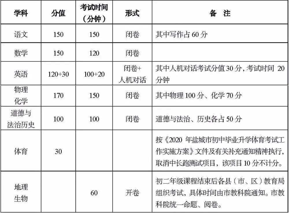 《盐城市2020年初中毕业与升学考试方案》