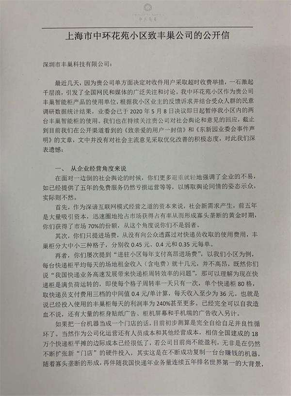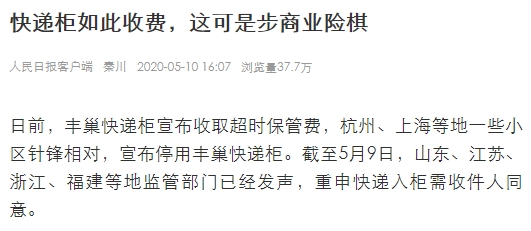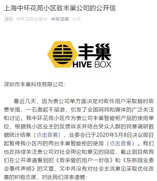5月10日,上海首家因丰巢超时收费而停用的小区中环花苑发出致丰巢的公开信,文章迅速刷屏,获得10万加的点击量。