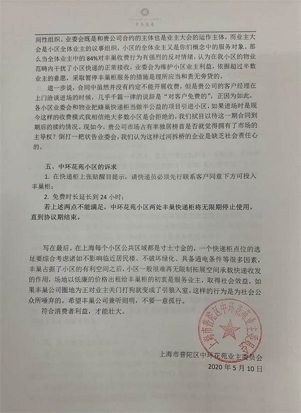 最后,业委会直言,在上海每个小区公共区域都是寸土寸金的,一个快递柜点位的选址要综合考虑诸如不影响临近居民楼、不破坏绿化、具备通电条件等很多因素,丰巢占据了小区的有利空间之后,小区一般很难再无限制拓展空间承载快递收发的作用,场地以低廉的价格出租给丰巢柜的初衷是服务业主,取得社会效益,如果丰巢公司圈地为王对业主关门打狗就变成了引狼入室。这样的行为是为社会公众所唾弃的。希望丰巢公司兼听则明,不要一意孤行。