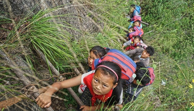 孩子从家里到山脚下的小学,光是爬藤梯就要花去两三个小时,尤其是冬天用那懂得通红的小手抓藤梯,令人在担心之余红了眼眶。
