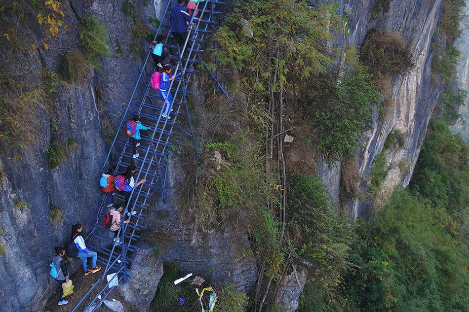 藤梯从悬崖上挂下来,一条接一条,有一些甚至是90度垂直下来的,而且又窄又滑又没扶手。每次村民外出和孩子上学,都要从垂直800米的悬崖上踩着藤梯爬下来,险象环生令人看着无比揪心。