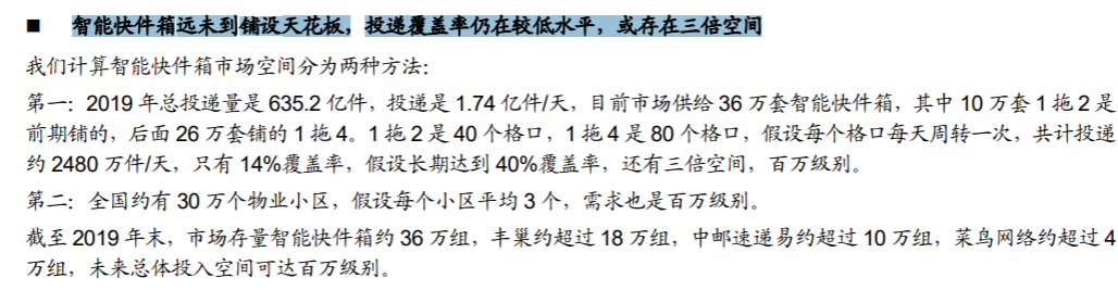 国信证券的相关报告也证明,电商行业的发展所带来的快件增长,目前快递柜的渗透率还有3倍的增长空间。
