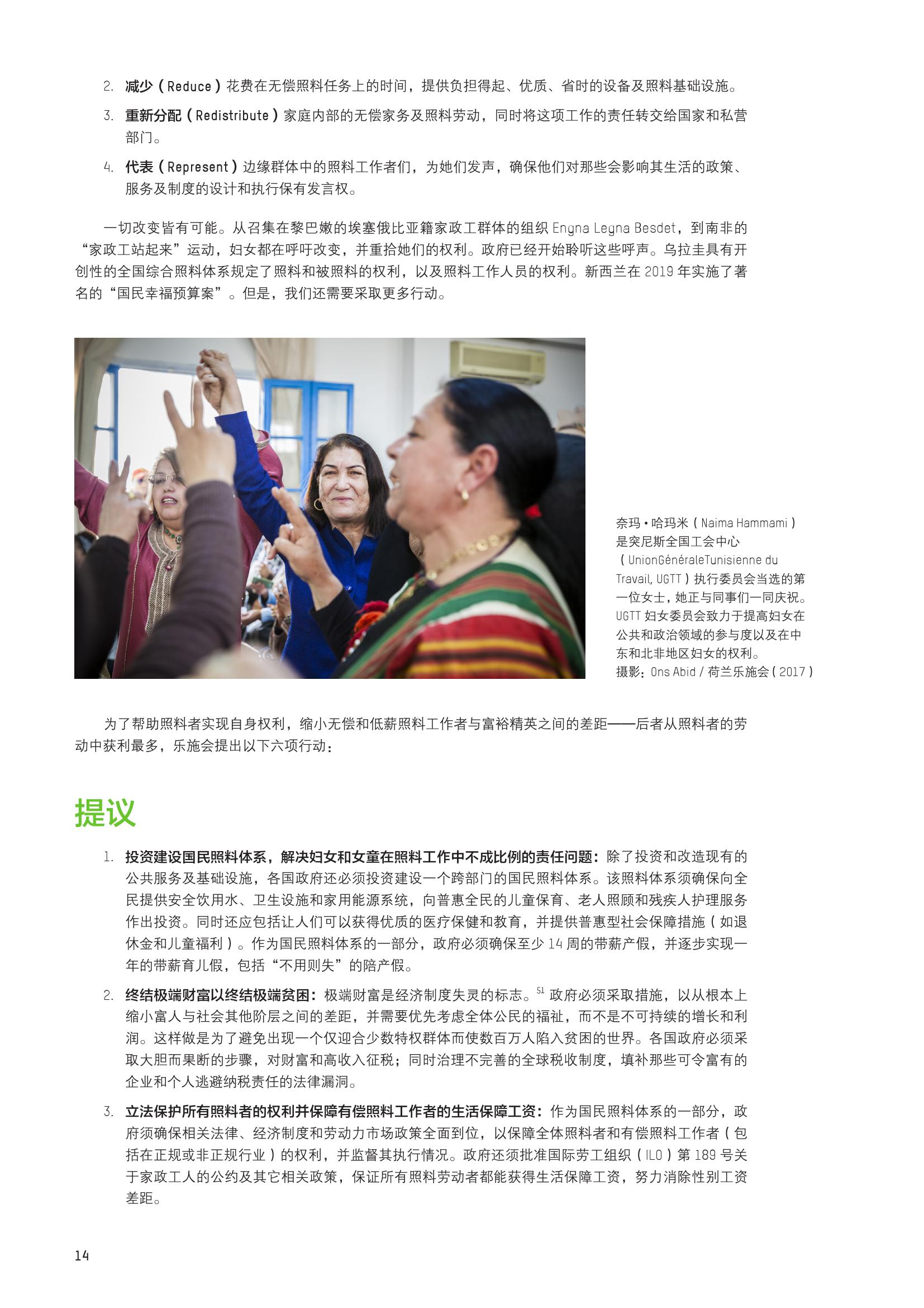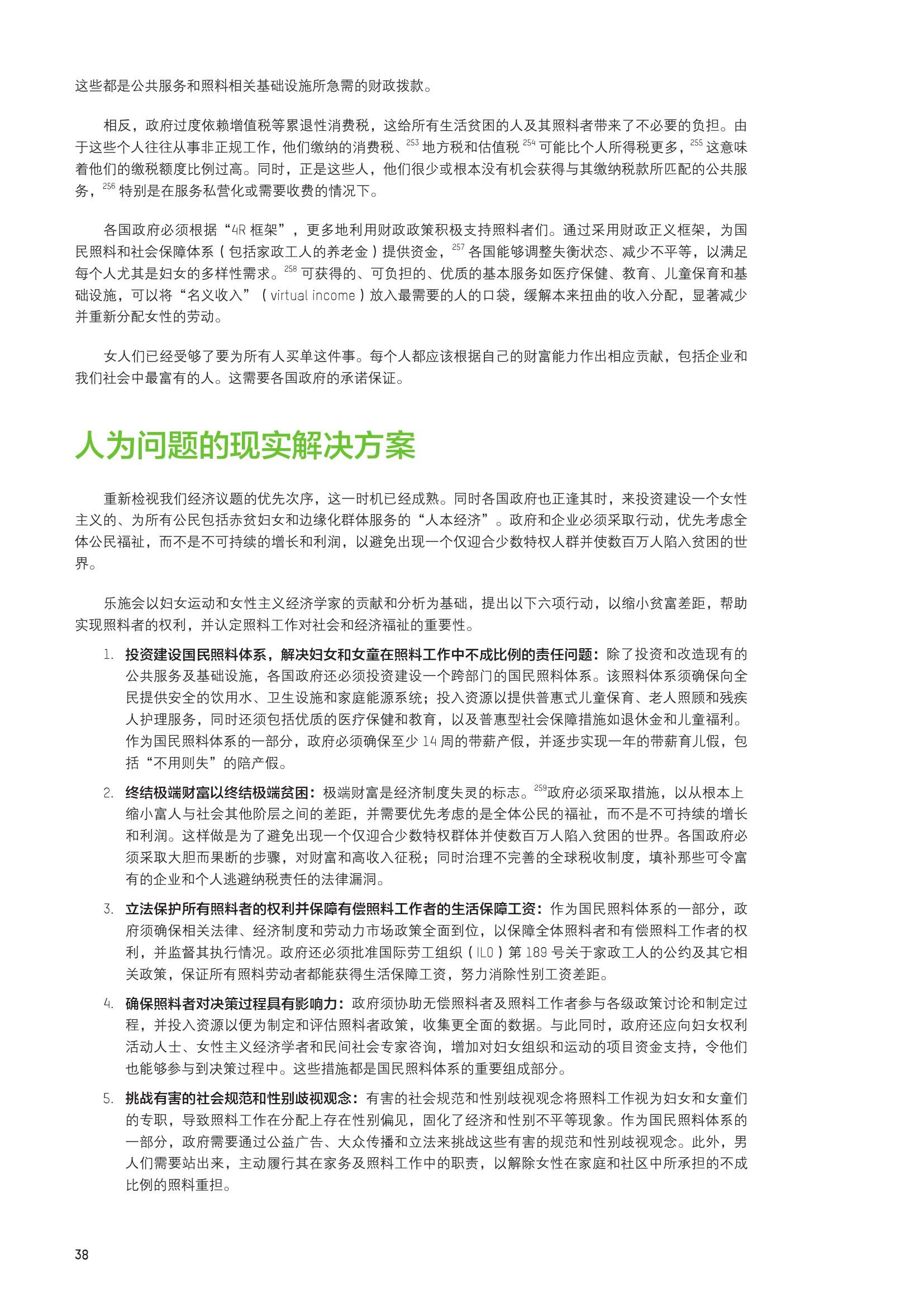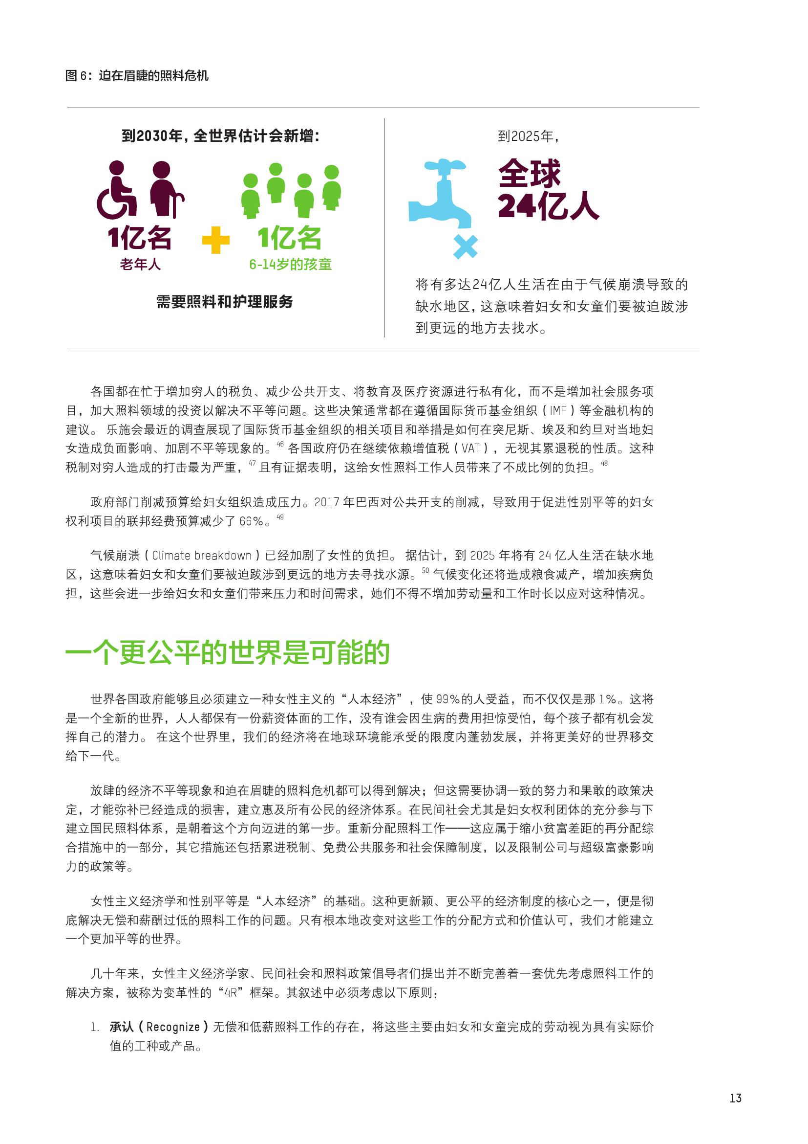 上述局面必须改变。各国政府亟需采取行动来建立一种女性主义的、重视真正社会价值的“人本经济”,而不是刺激对利润和财富的无休止追求。对国民照料体系进行投资,解决由妇女和女童承担的不成比例的照料责任;实行累进税制,包括对财富征税;立法支持照料工作者——这些是可实现且至关重要的第一步。