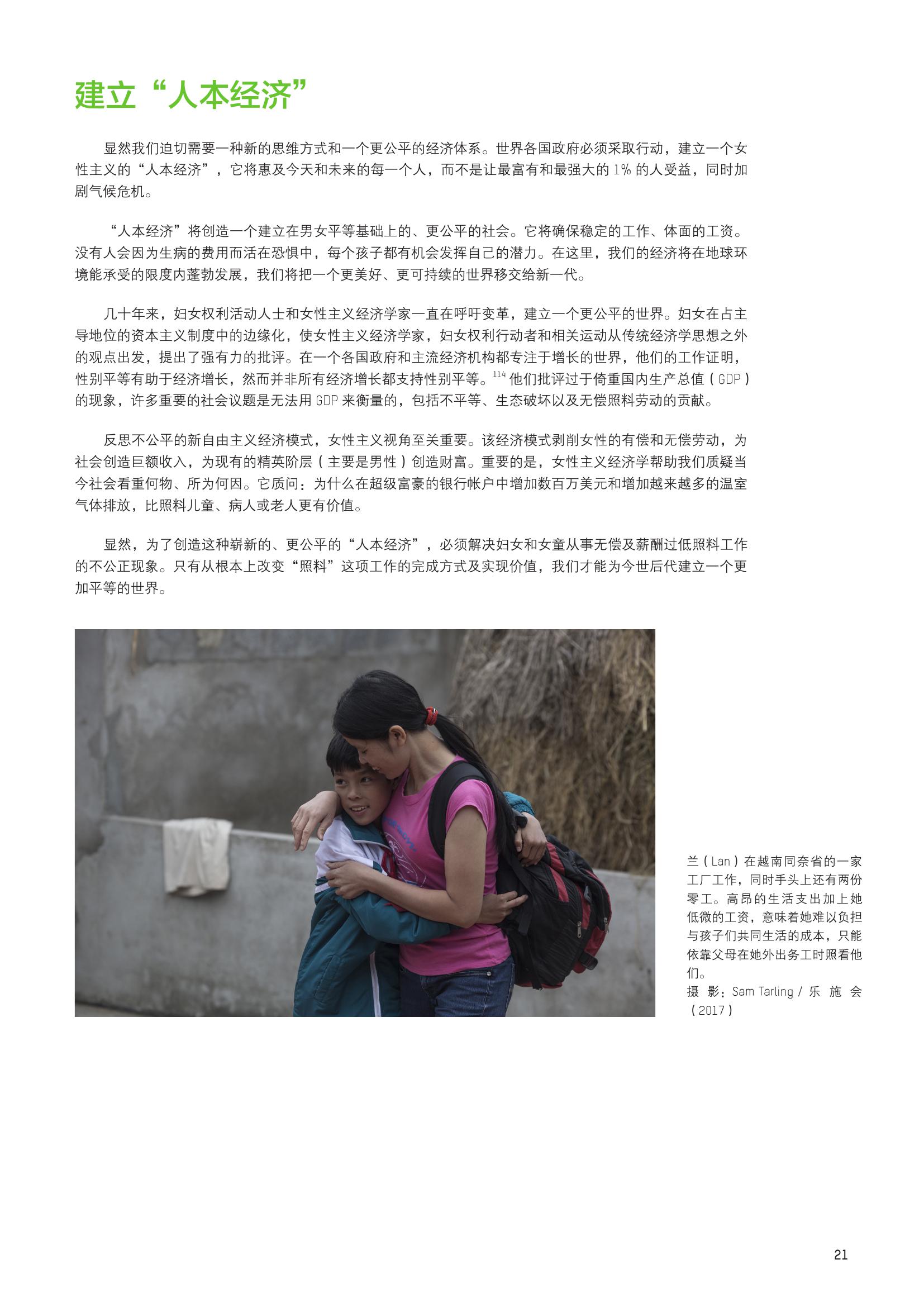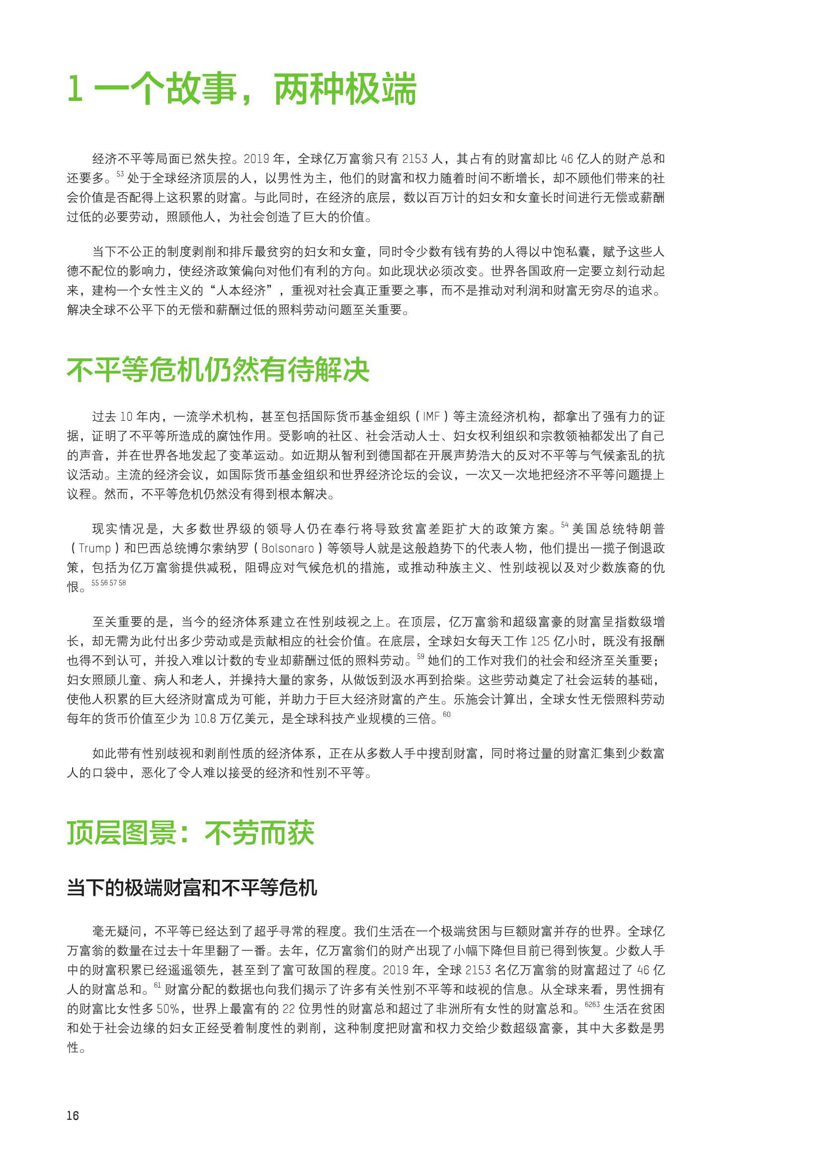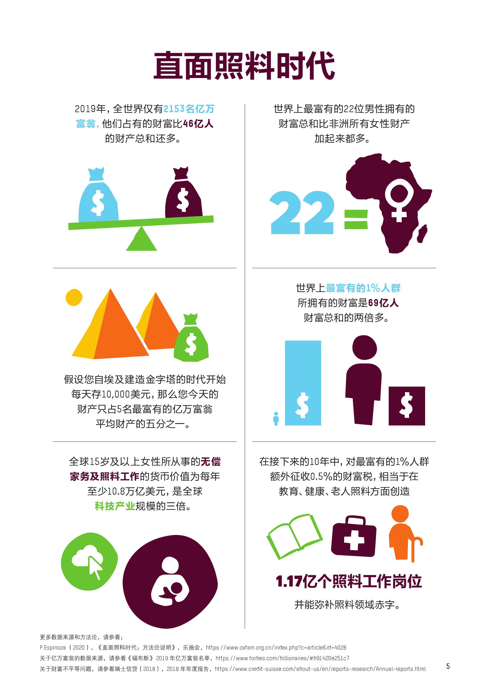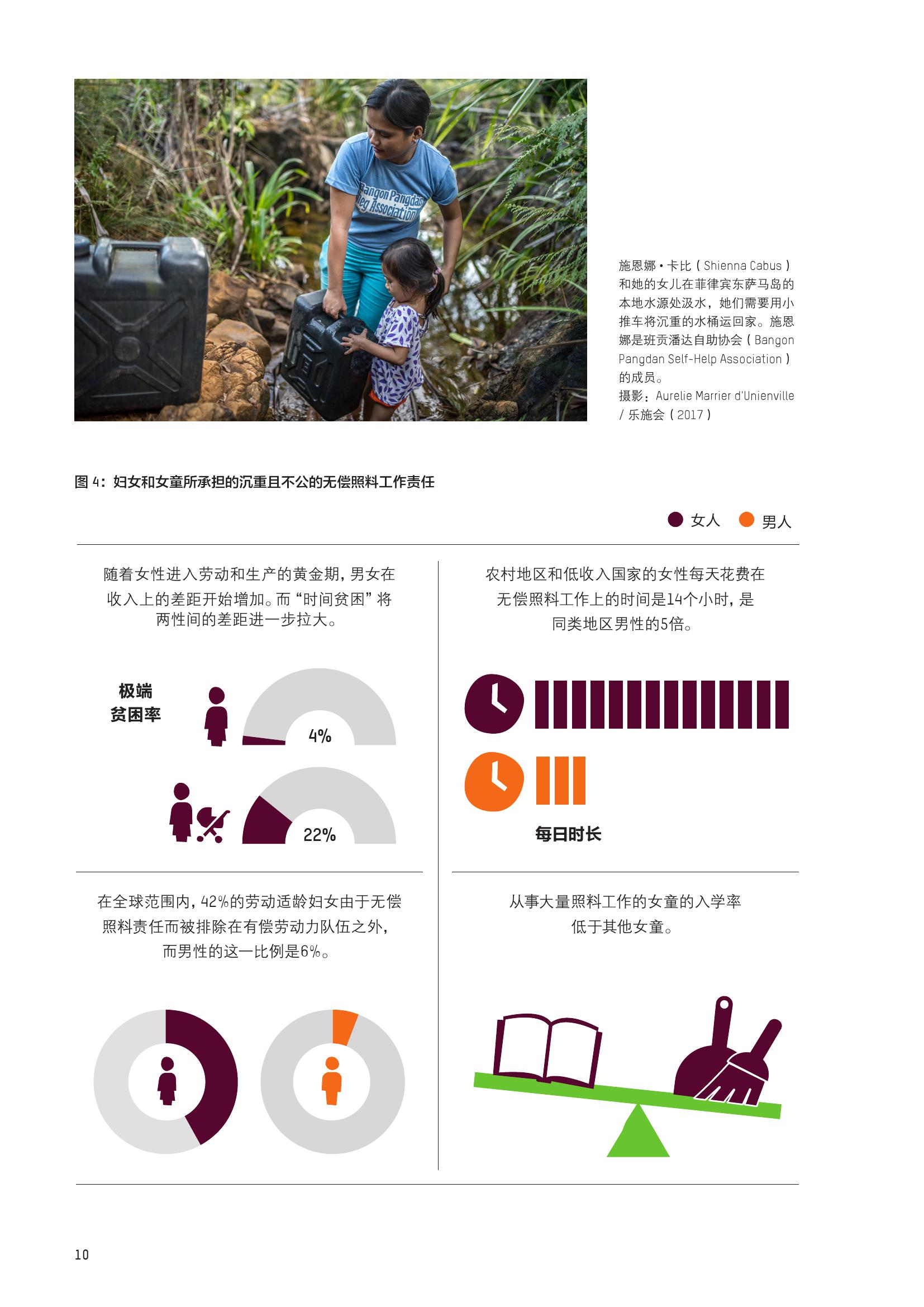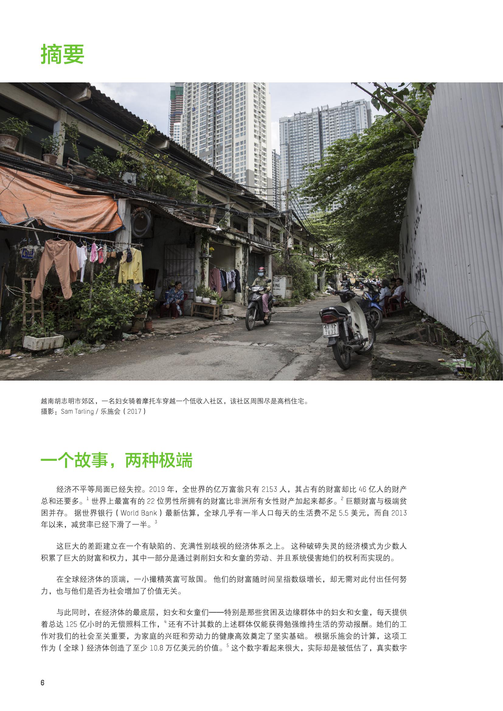 经济不平等现象已然失控。2019年,全世界的亿万富翁只有2153人,其占有的财富却比46亿人的财产总和还多。这巨大的差距建立在一个有缺陷的、充满性别歧视的经济体系之上。该体系只知珍视少数特权人群(大多数是男性)的财产;却对(每年累计)过百亿小时的、极其重要的无偿及薪酬过低的照料工作视而不见,这些工作主要由全球各地的妇女和女童完成。照料他人、做饭、打扫、汲水和拾柴——这些都是维系社会和社区福祉、保证经济正常运转的日常必备劳作。繁重且不平等的照料工作固化了性别和经济不平等现象。