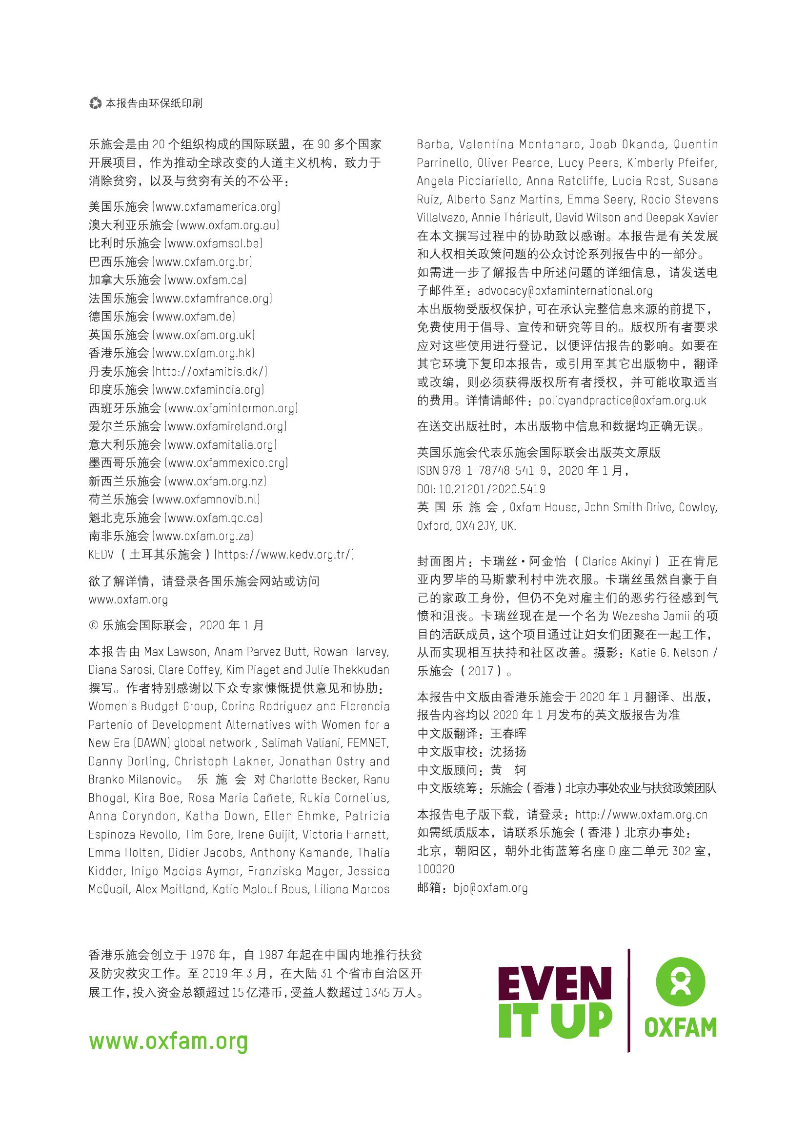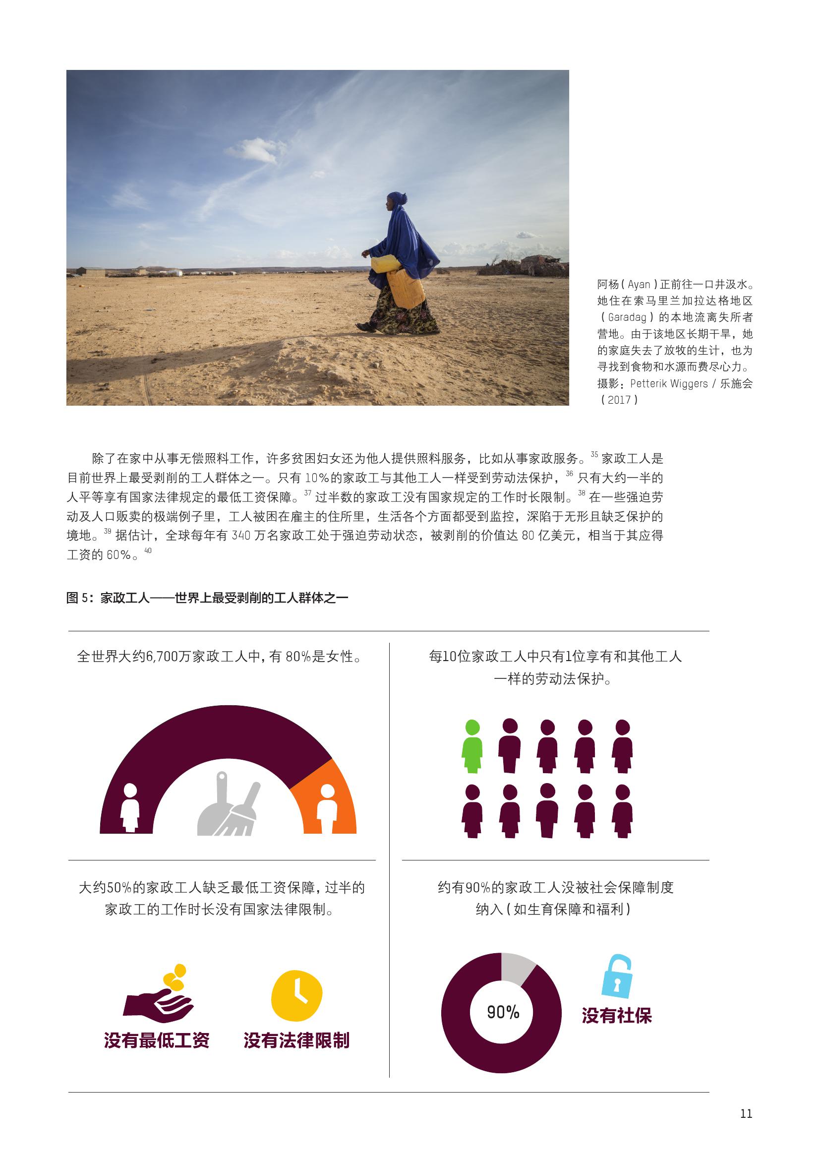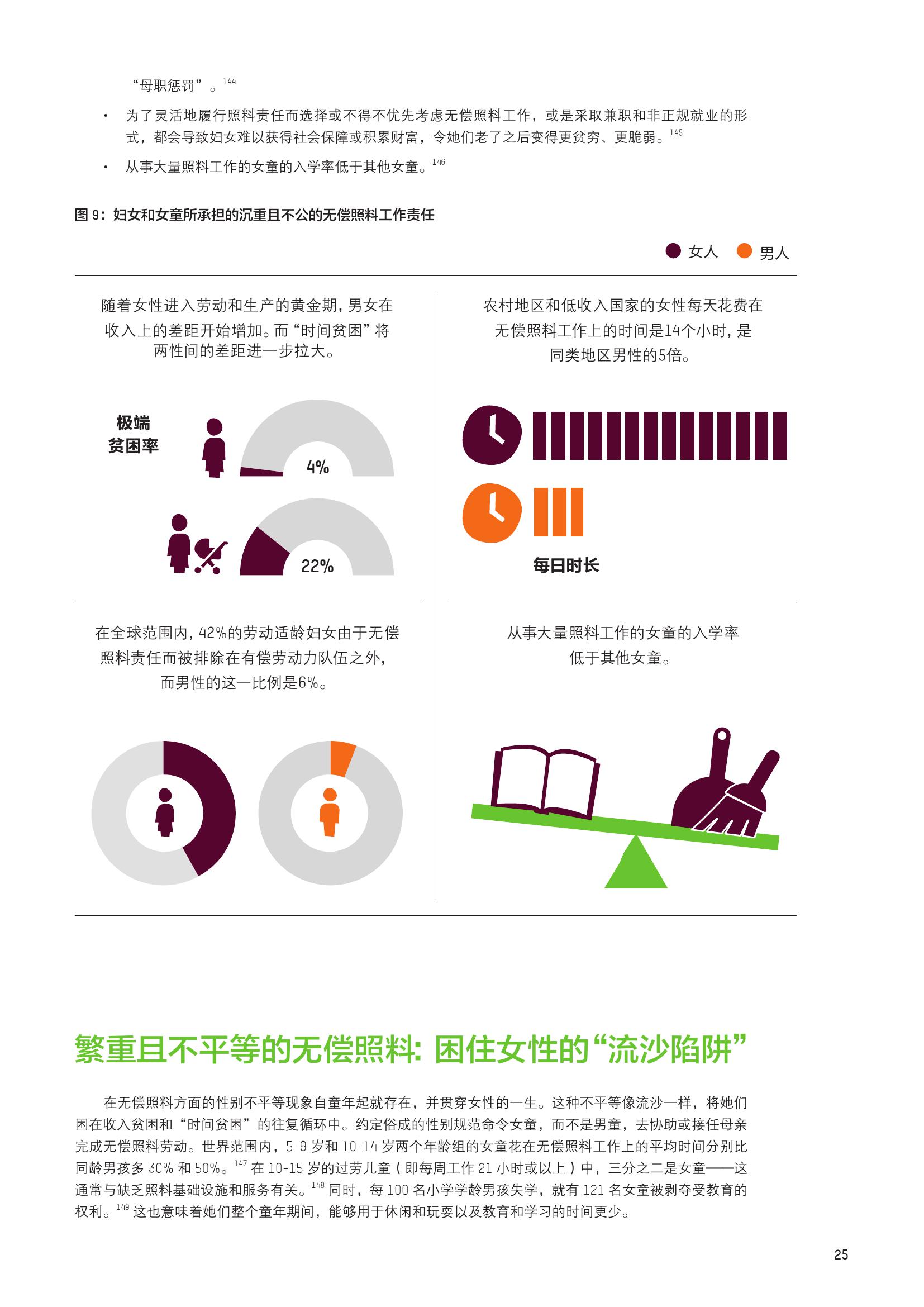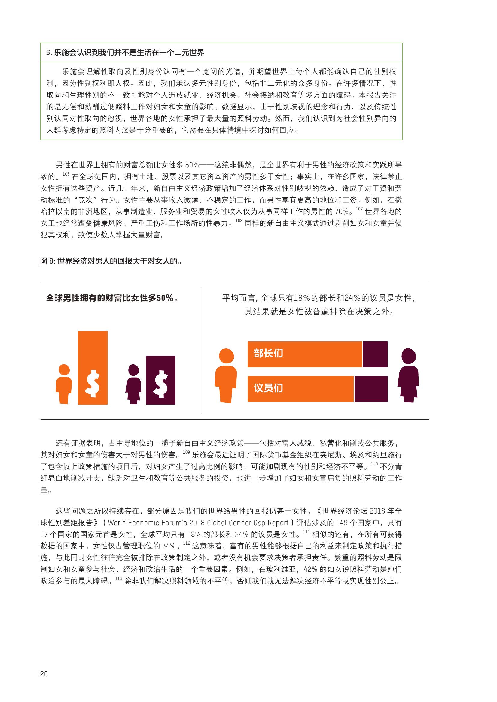 经济不平等现象已然失控。2019年,全世界的亿万富翁只有2153人,其占有的财富却比46亿人的财产总和还多。这巨大的差距建立在一个有缺陷的、充满性别歧视的经济体系之上。该体系只知珍视少数特权人群(大多数是男性)的财产;却对(每年累计)过百亿小时的、极其重要的无偿及薪酬过低的照料工作视而不见,这些工作主要由全球各地的妇女和女童完成。照料他人、做饭、打扫、汲水和拾柴——这些都是维系社会和社区福祉、保证经济正常运转的日常必备劳作。繁重且不平等的照料工作固化了性别和经济不平等现象。
