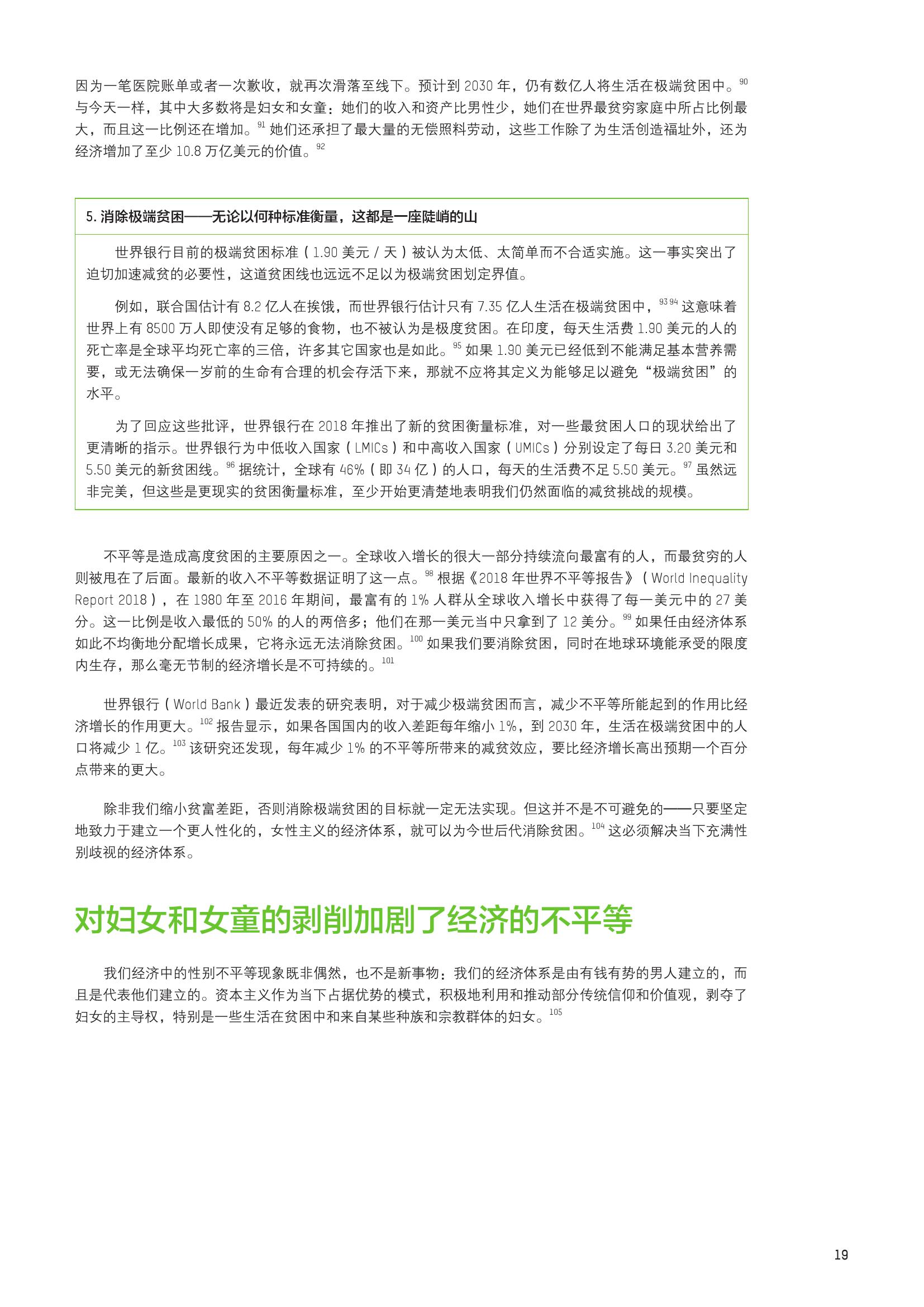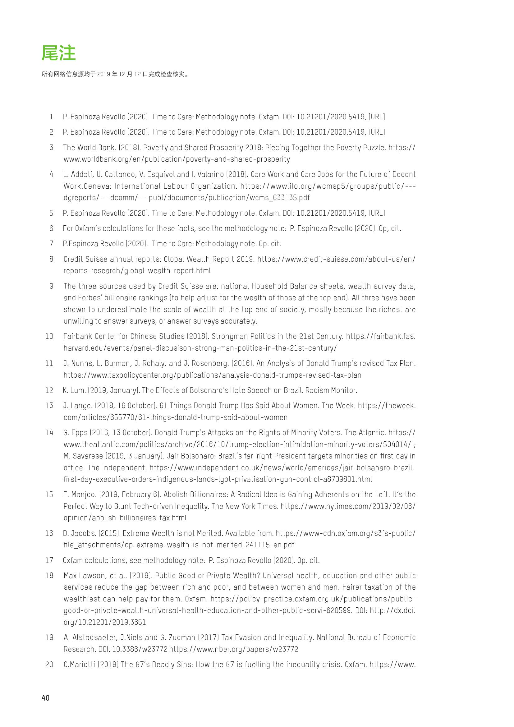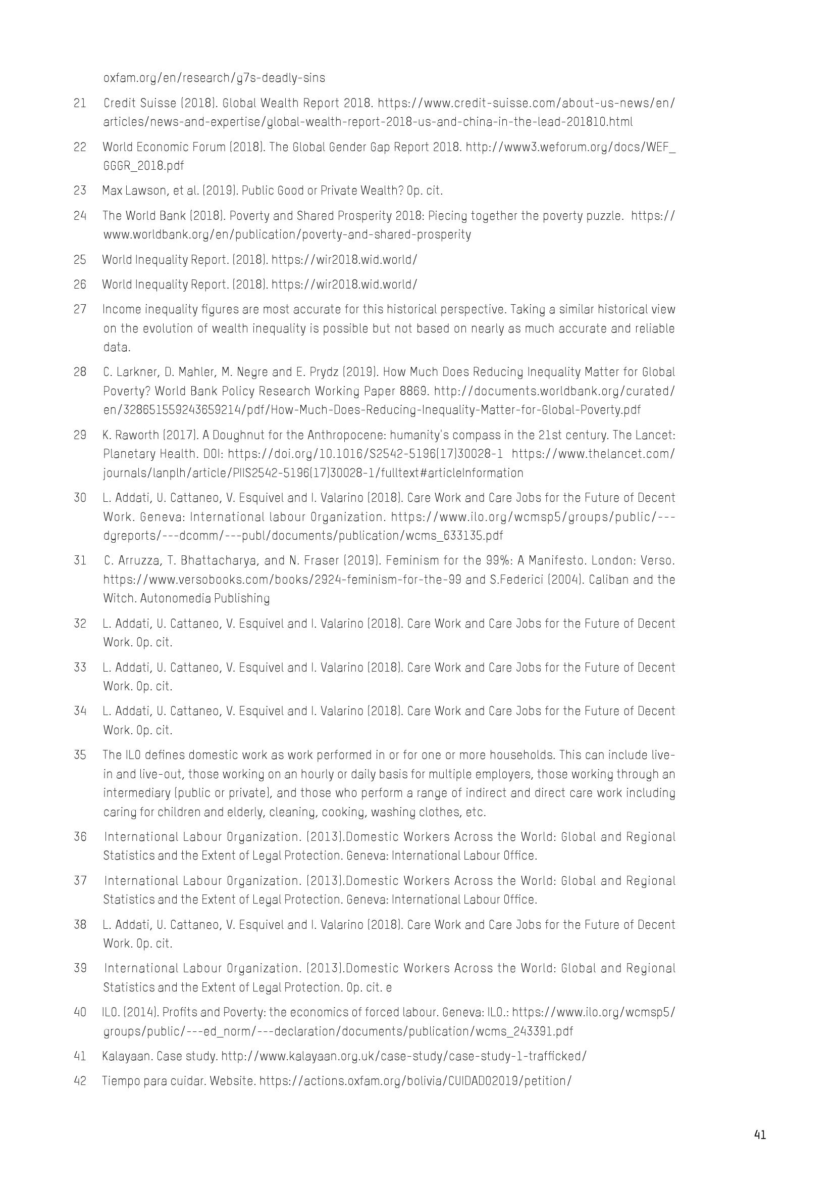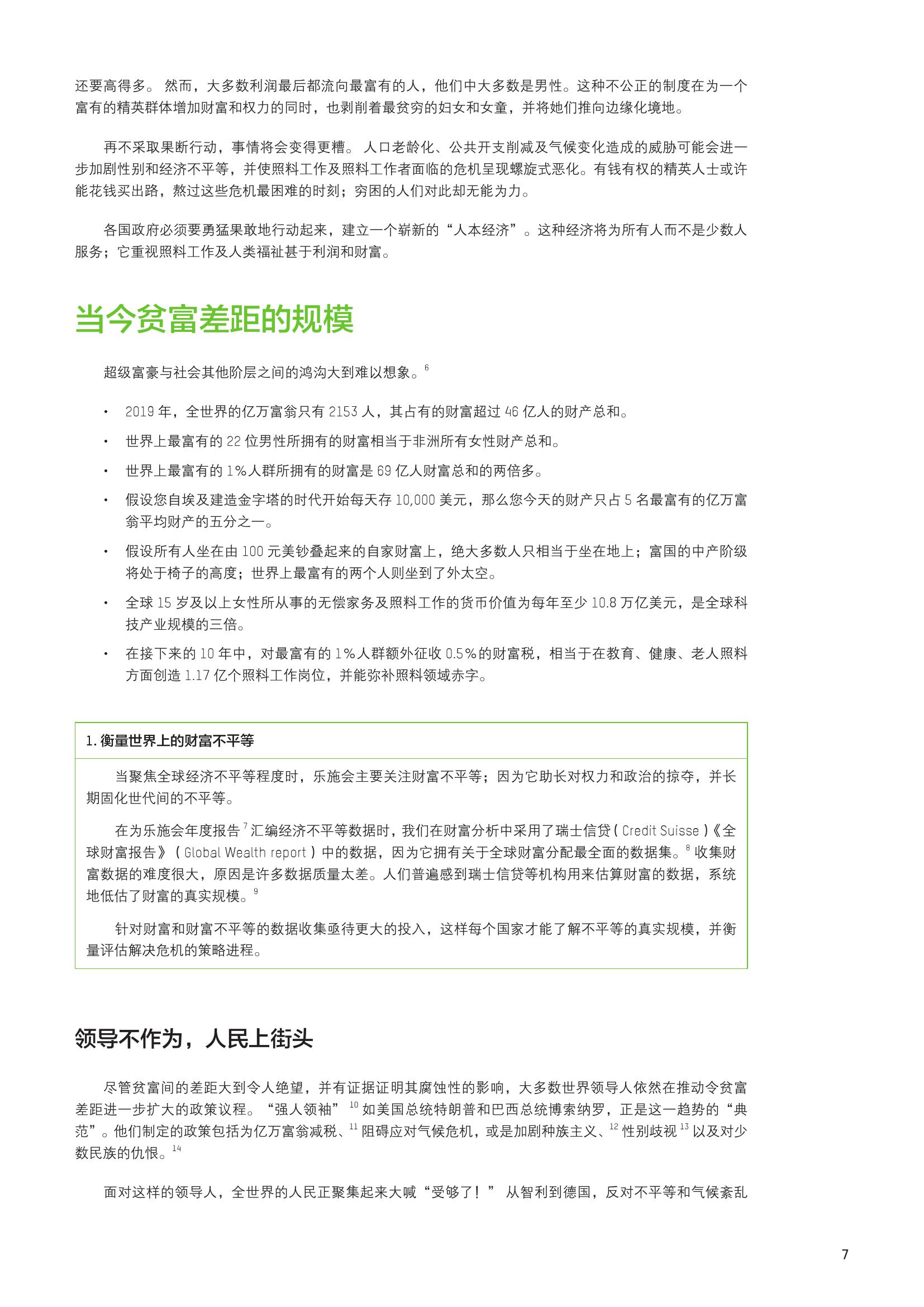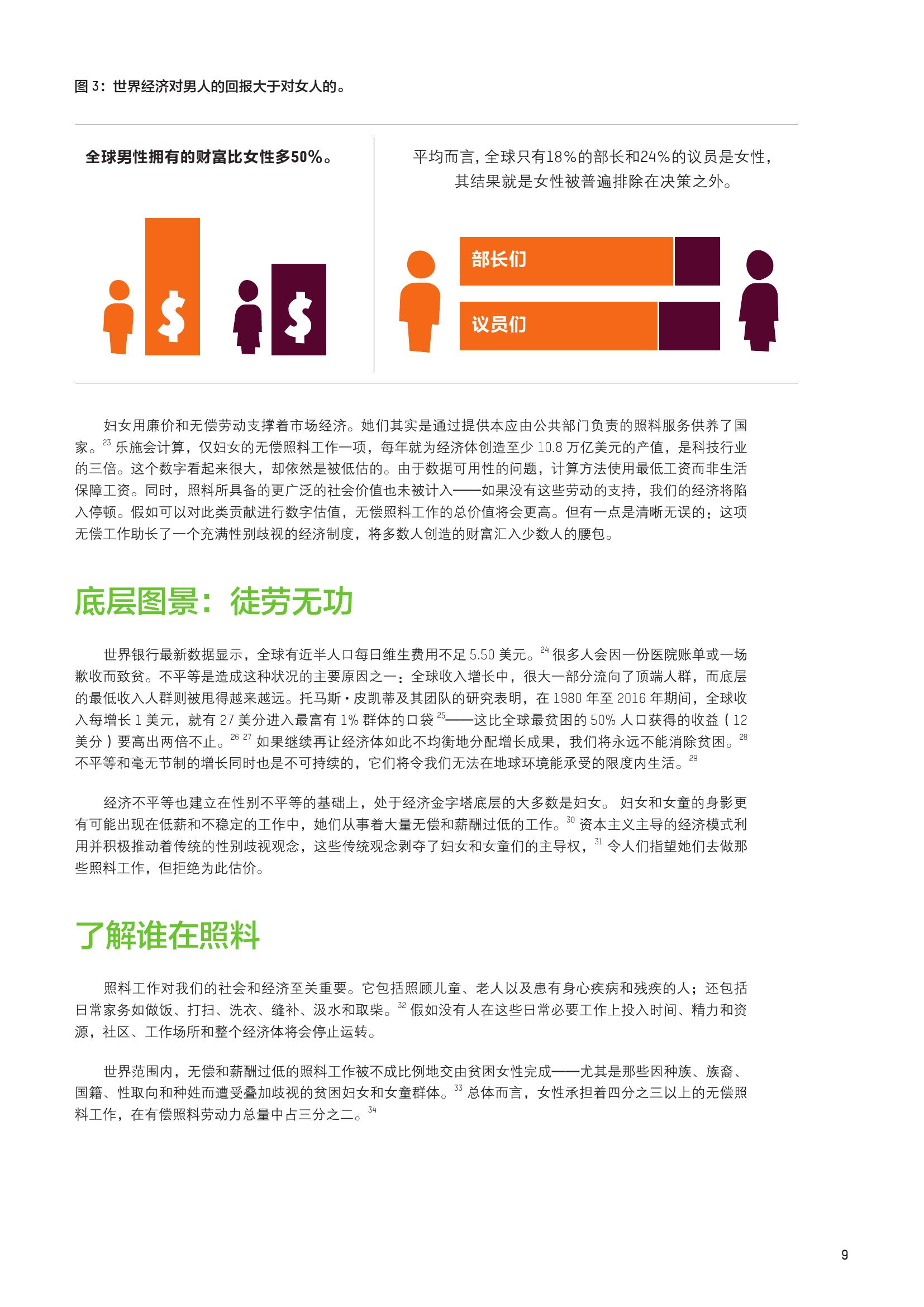 经济不平等现象已然失控。2019年,全世界的亿万富翁只有2153人,其占有的财富却比46亿人的财产总和还多。这巨大的差距建立在一个有缺陷的、充满性别歧视的经济体系之上。该体系只知珍视少数特权人群(大多数是男性)的财产;却对(每年累计)过百亿小时的、极其重要的无偿及薪酬过低的照料工作视而不见,这些工作主要由全球各地的妇女和女童完成。照料他人、做饭、打扫、汲水和拾柴——这些都是维系社会和社区福祉、保证经济正常运转的日常必备劳作。繁重且不平等的照料工作固化了性别和经济不平等现象。