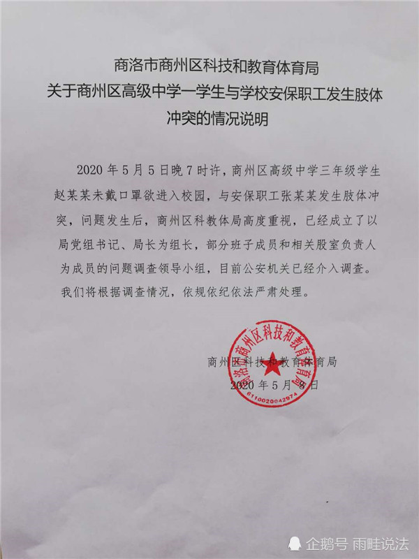 5月5日,陕西商洛,高三学生赵某某未戴口罩进入校园,在安检口。与一位头顶光亮、身穿格子衬衫的大叔起了冲突。通过现场视频发现,旁边还有两位身穿制服的保安大叔。