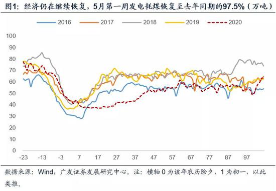 第一,经济仍在继续恢复。5月第一周发电耗煤和30城地产销售恢复至去年同期的97.5%。全国餐饮、住宿行业消费规模恢复至去年同期70%左右;旅游市场恢复至同期的50%。