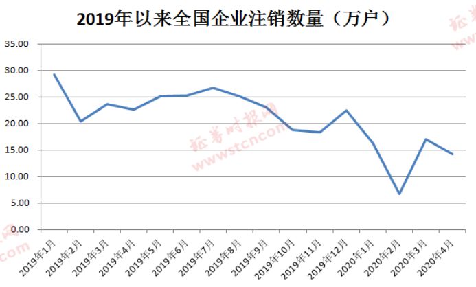 除此以外,记者还发现,疫情期间企业注销数据体量虽然很大,但若从历史的角度来看,其实并不高。企查查数据显示,2019年全年,全国企业注销总数达280.31万户,月均注销数为23.36万户;2019年2月至4月,全国企业注销量分别为20.33万户、23.67万户、22.56万户。