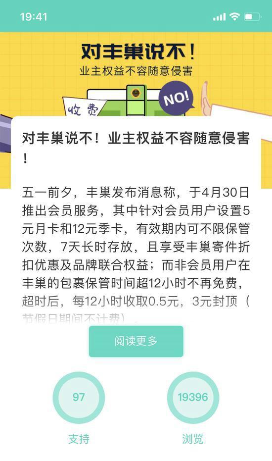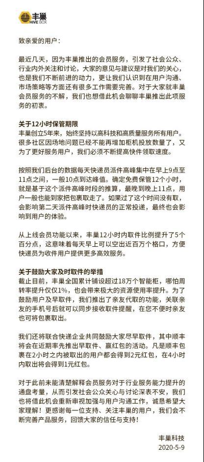 昨晚,丰巢突然妥协,在官方微博上发布了一份《丰巢会员服务说明》。文中,丰巢解释了新举措的初衷,并表示“已认识到问题,对之前的行为深表不安……”