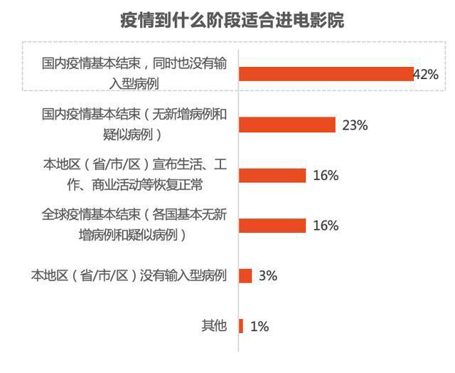 但是关于什么时机是观众认为的回到影院的“安全”时机,问卷显示“输入病例”是公众最担心的问题,认为目前“不太适合”或“完全不适合”观影的人群中,四成观众认为要等“国内疫情基本结束,同时也没有输入型病例”。