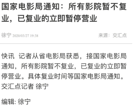 这种情况一直持续到3月16日,新疆、青海、内蒙古、甘肃、福建等地部分影院曾短暂复工营业。但3月27日,新华日报社旗下交汇点新闻从省电影局获悉,接国家电影局通知,所有影院暂不复业,已复业的立即暂停营业,具体复业时间等国家电影局通知。从尝试复工到再度停工,不过隔了十天时间,此前逐步恢复营业的影院,再度全线停摆。
