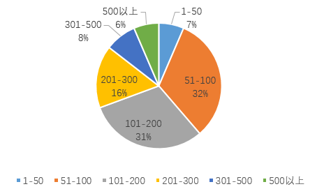 从门店规模来看,大部分门店的房间数量处于51-200间之间。50间以下小规模的门店以及500间以上大规模的门店数量都较为稀少。主要原因是200间以下房间规模的门店,在运营效率上能够达到较高的水平,管理难度小。